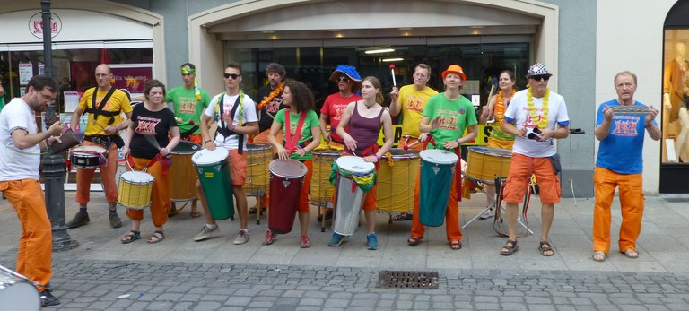 Die Trommler*innen kommen aus den unterschiedlichsten Kreisen: Einige sind nach Marburg oder Gießen umgezogen und haben vorher in anderen Gruppen mitgespielt, einige hat das Fieber nach einem Workshop oder Auftritt von uns ergriffen, einige haben ihre Nasen auch aus reinem Interesse mal reingesteckt und konnten einfach nicht widerstehen. Altersmäßig sind wir sehr gemischt, aktuell von 26 bis 73 Jahren, von der Studentin bis zum Rentner.